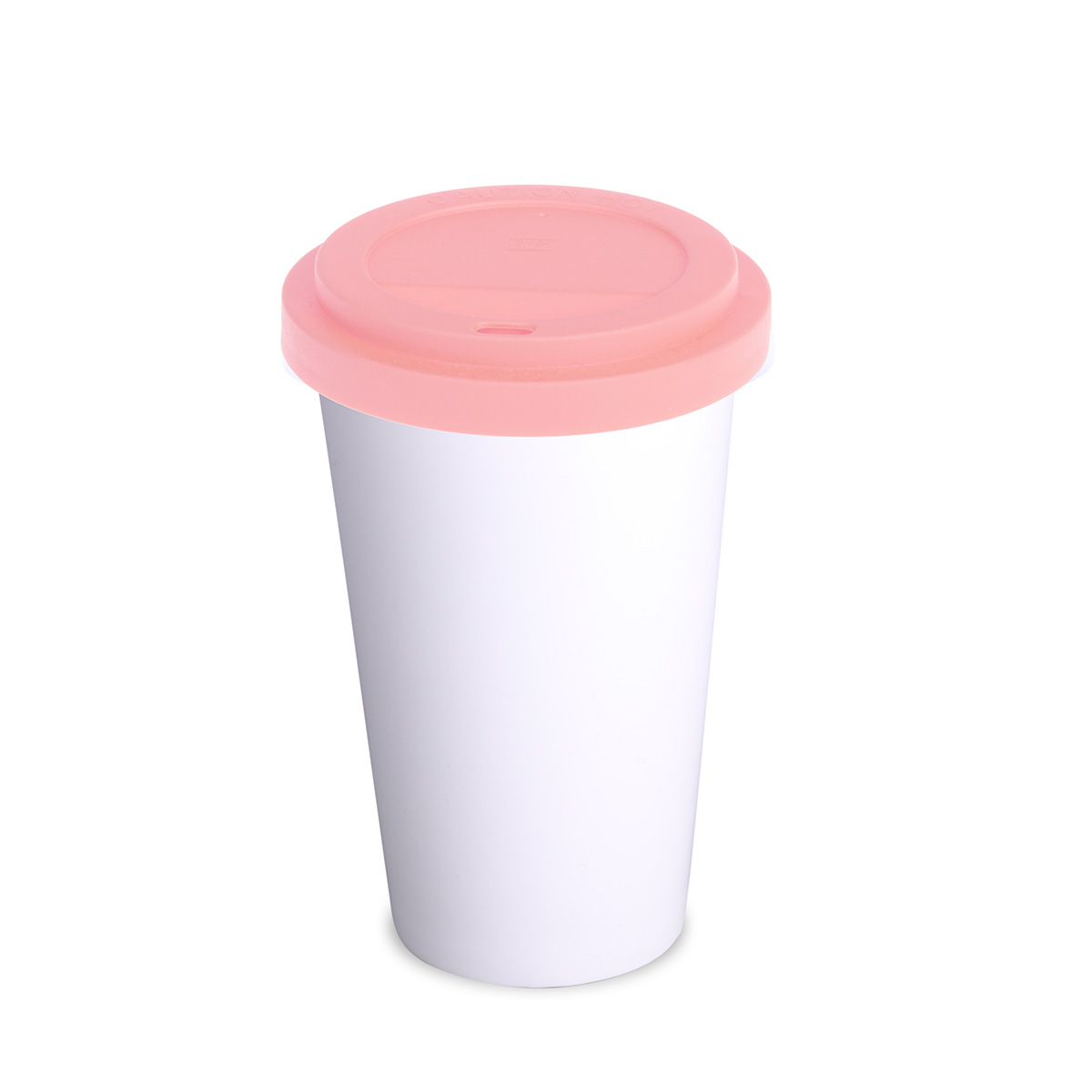 Taza de porcelana promocional con tapa de polímero que protege contra derrames accidentales de bebidas. Modelo dirigido a personas activas, amantes de las excursiones y los viajes. Gracias a su estructura interna de doble pared de porcelana, poco habitual, esta taza se caracteriza por un mayor nivel de aislamiento térmico. El cuerpo de la taza está disponible en blanco y negro satinado. La tapa está disponible en los siguientes colores: blanco, naranja 021C, gris Cool Gray 7, azul marino 294C, marrón 4695C, negro, rosa 4064C, azul 2144C, eucalipto 5493C y arena del desierto 2310C.